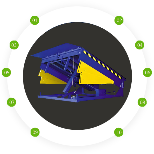 液压登车桥:是实现货物快速装卸的辅助设备,高度调节功能使货车与库房的货台之间架起一座桥梁,叉车可驶入货车内部进行货物的批量装卸,也叫装卸平台。